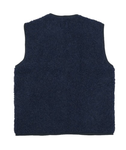 Gilet sans manche en laine irlandaise bleu foncé, bords passepoilés, fermeture éclair, 2 poches plaquées.