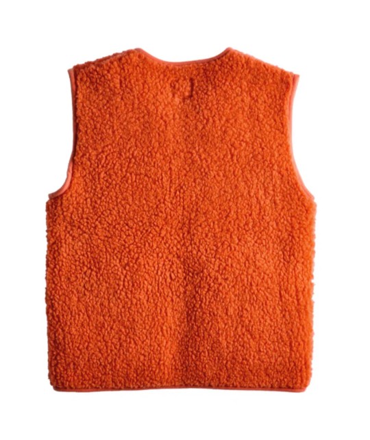 Gilet sans manche en laine irlandaise orange, bords passepoilés, fermeture éclair, 2 poches plaquées.