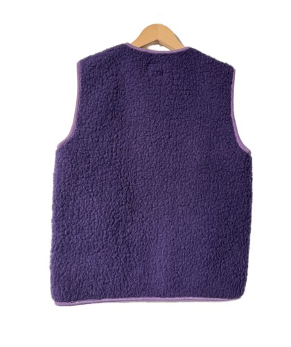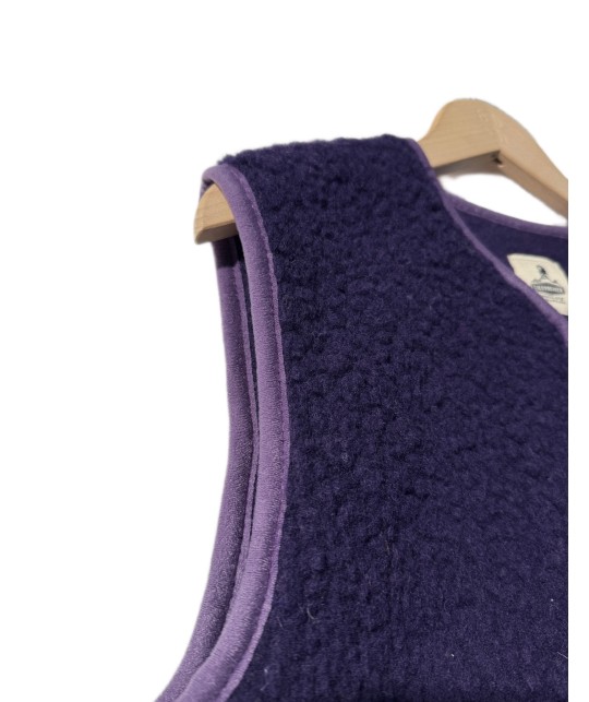Gilet sans manche en laine irlandaise violet, bords passepoilés, fermeture éclair, 2 poches plaquées.
