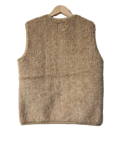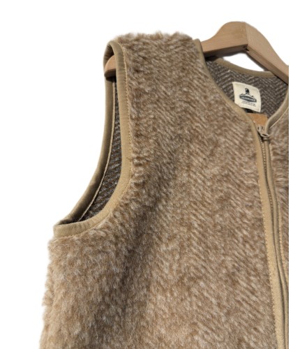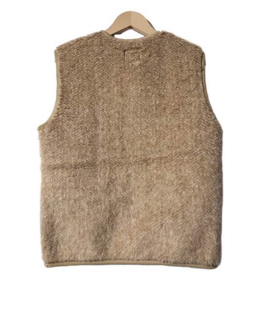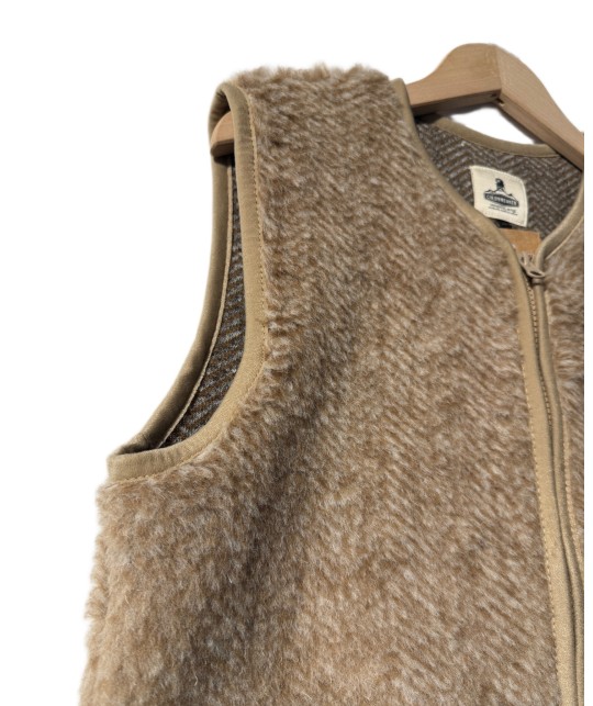 Gilet sans manche en laine irlandaise, bords passepoilés, fermeture éclair, 2 poches plaquées. Camel motif chevrons.