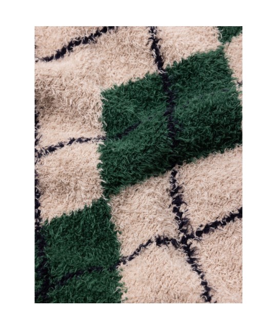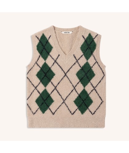 Pull sans manche en coton bio écru à motif losanges vert et noir.