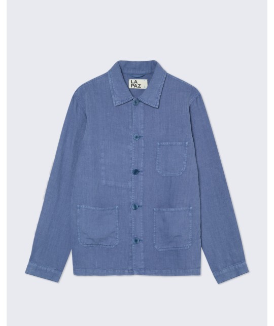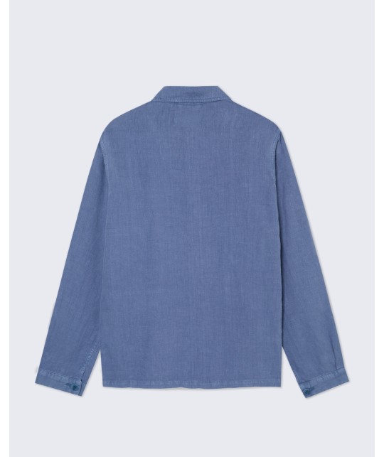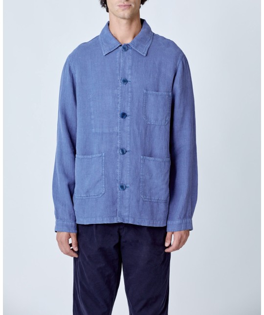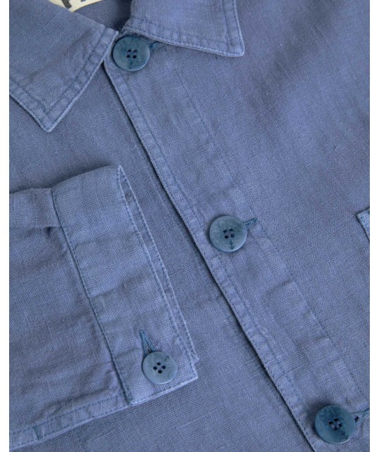 Veste en lin indigo délavé. 3 poches plaquées, 1 poche intérieure. Boutons en corozo